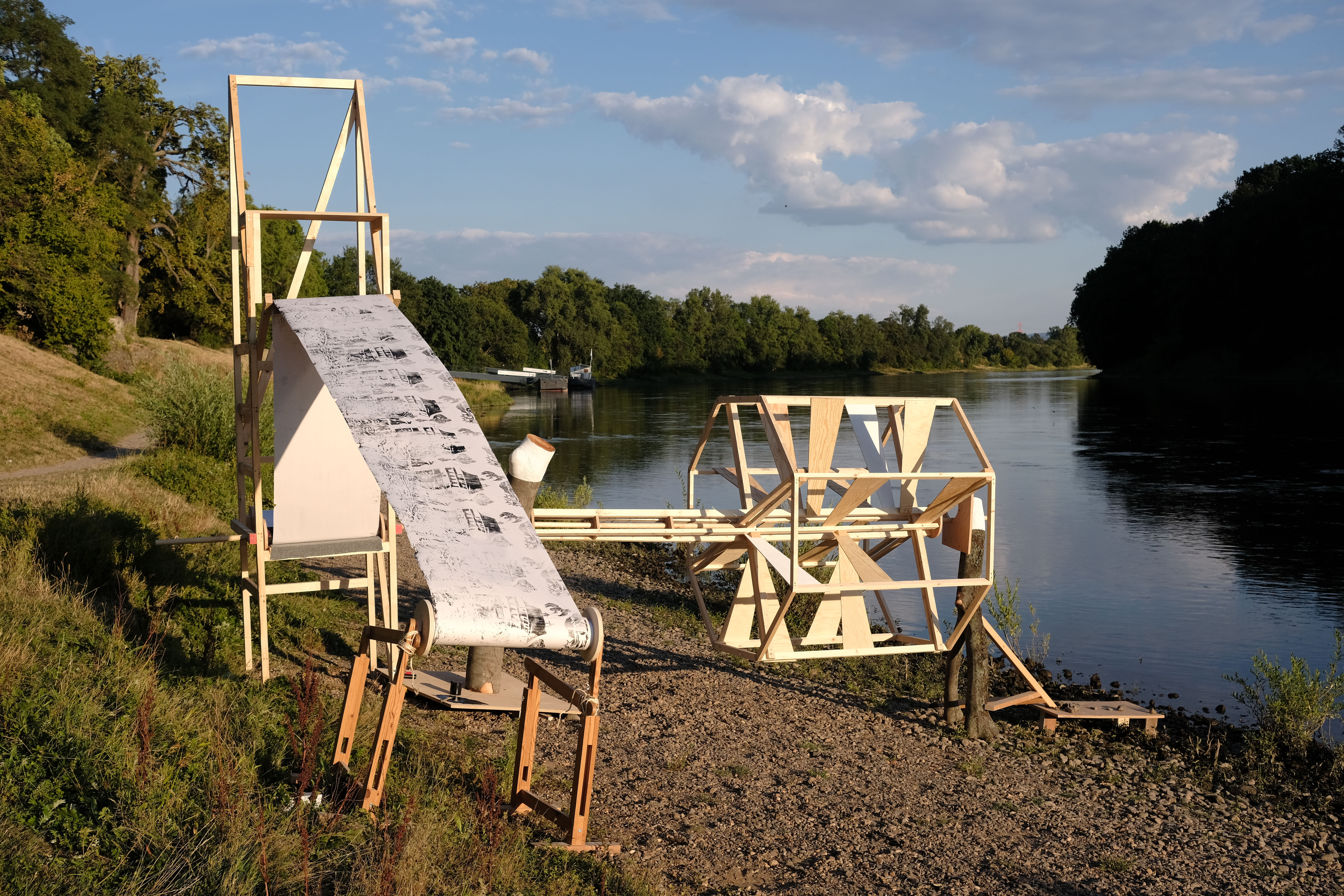 A one week research workshop taken place along the River Elbe, making river powered press printing machine.